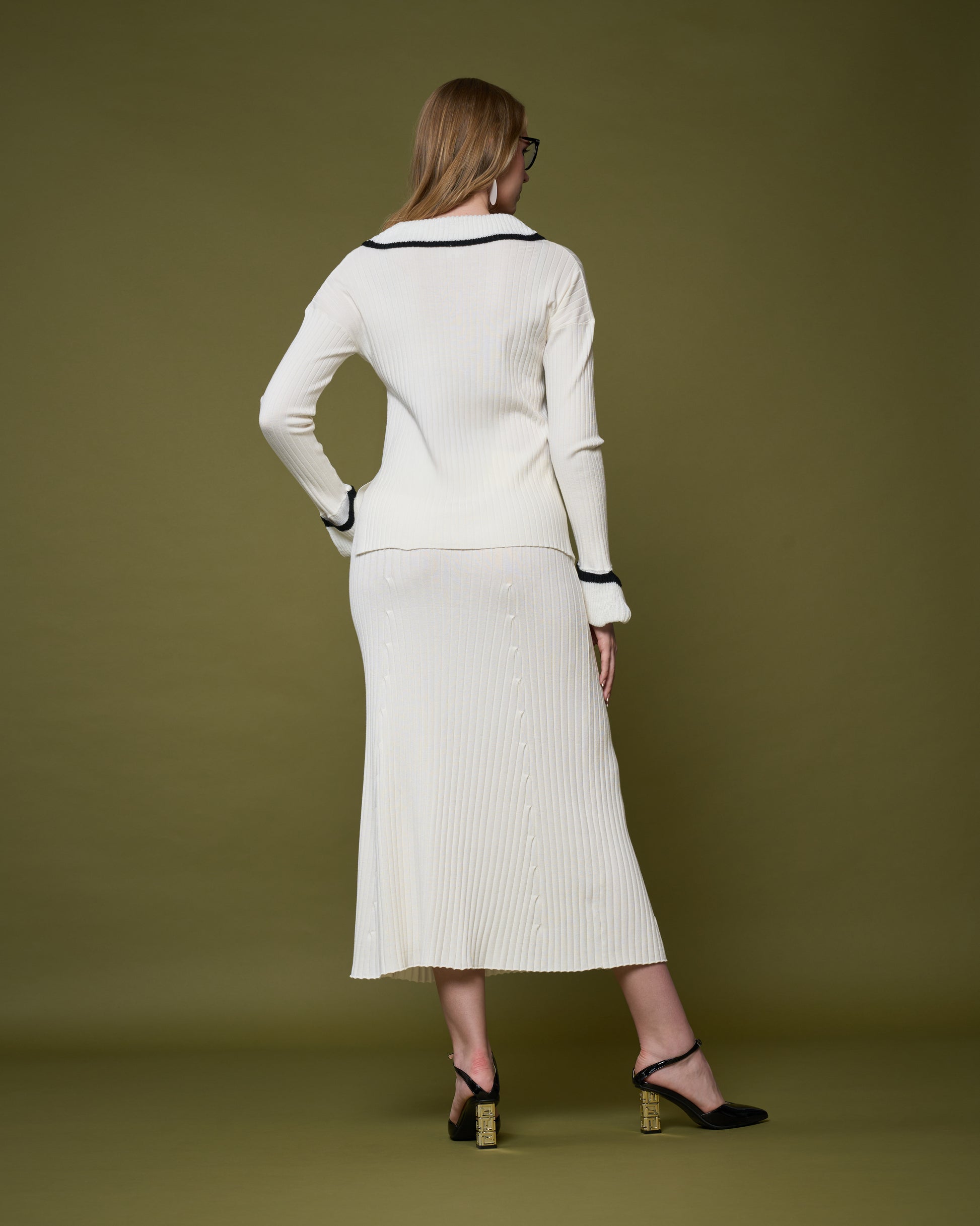 The ribbed texture adds dimension and structure, while the open neckline with a wide collar lends a polished, modern look. Perfect for both office wear and casual outings.