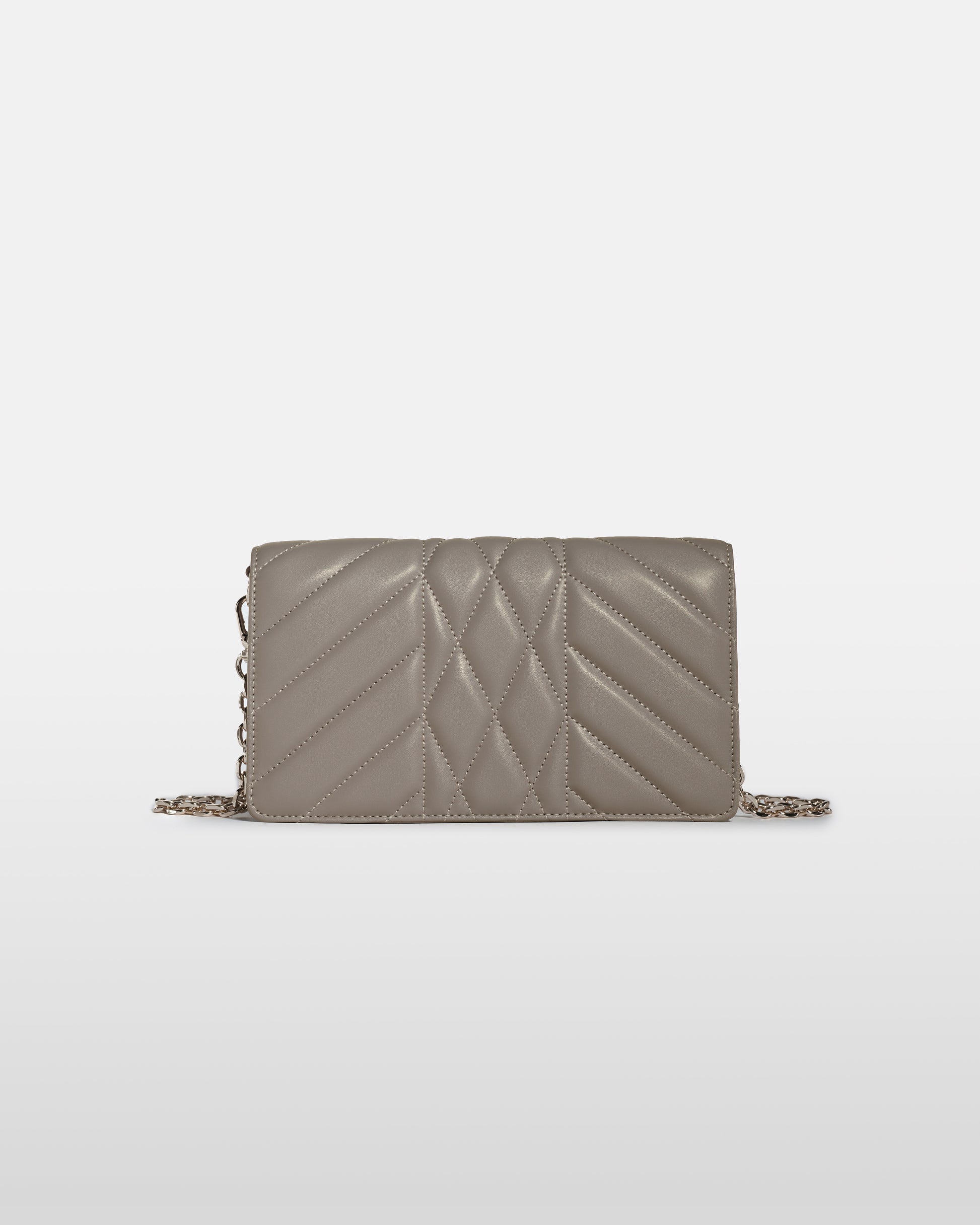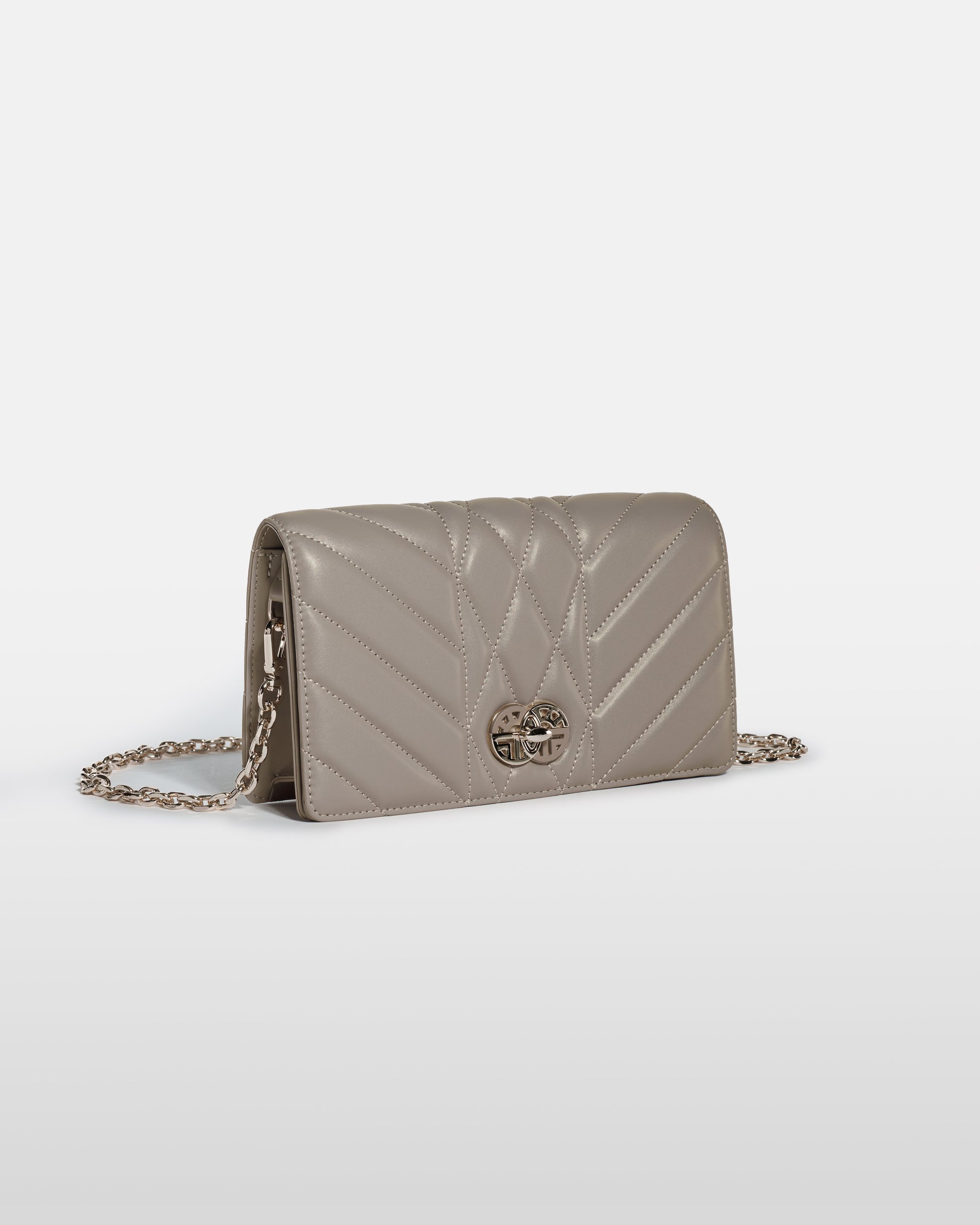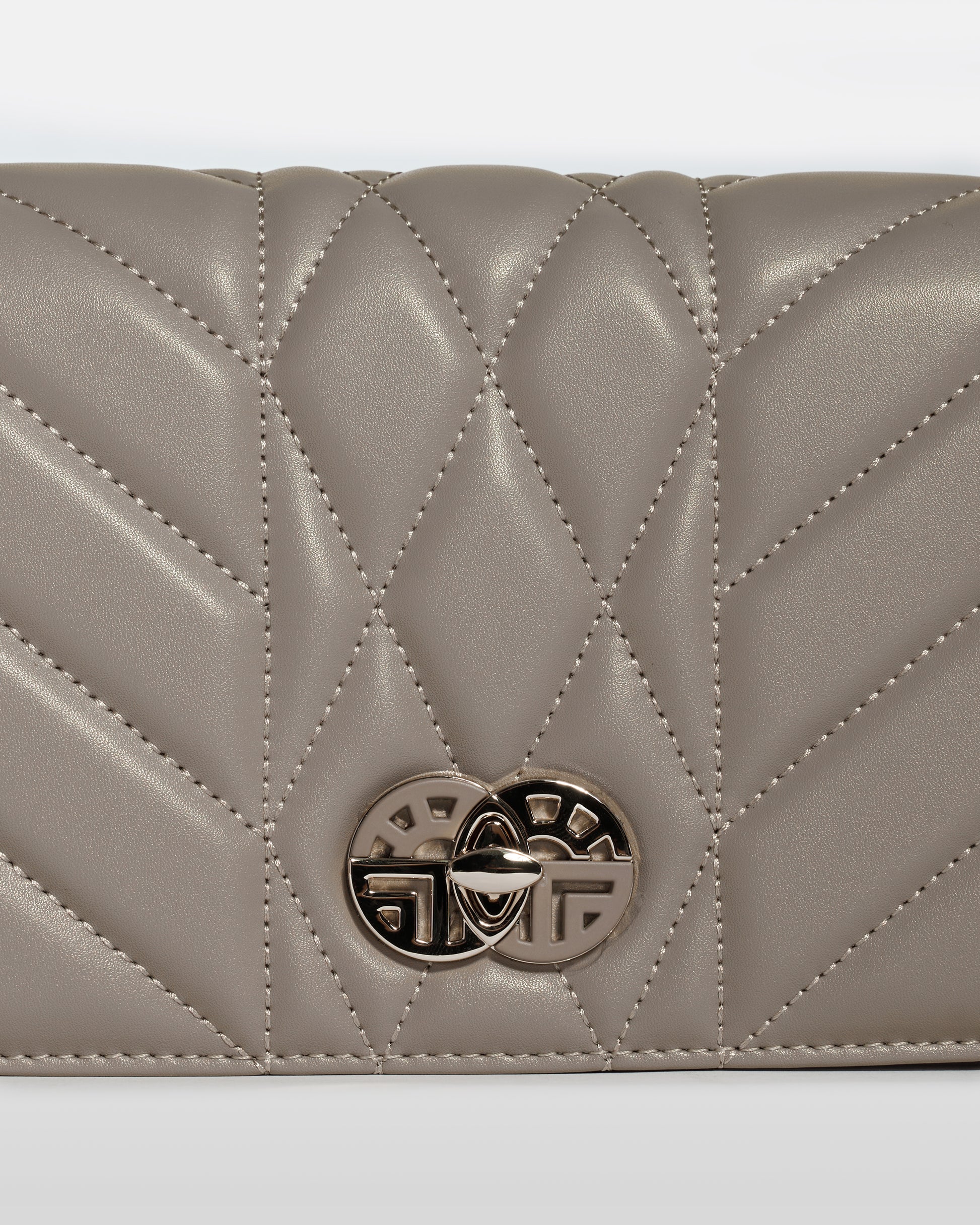 This sand-toned clutch pairs gold accents with quilted detailing, delivering timeless elegance and refined versatility for elevated ensembles.